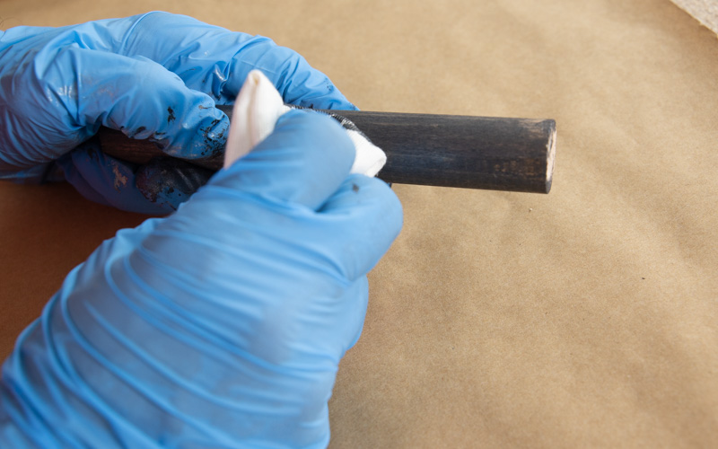 Por último, con un poco de cola blanca pega los tacos circulares en los agujeros. La cola blanca la aplicamos para ofrecerle al soporte un poco más de seguridad, así nos garantizamos que el instrumento no cederá y caerá.