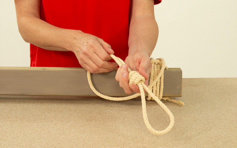 En los agujeros que hemos hecho, vamos a colocar unas cuerdas en los extremos de la viga para que nos funcione, además de como un elemento decorativo, como un sistema para colgarlo posteriormente en el techo. Debes hacer unos nudos tipo ahorcado en los extremos para que luego se pueda colgar en el techo. Después enróscalo sobre la viga y acaba con otro nudo.
