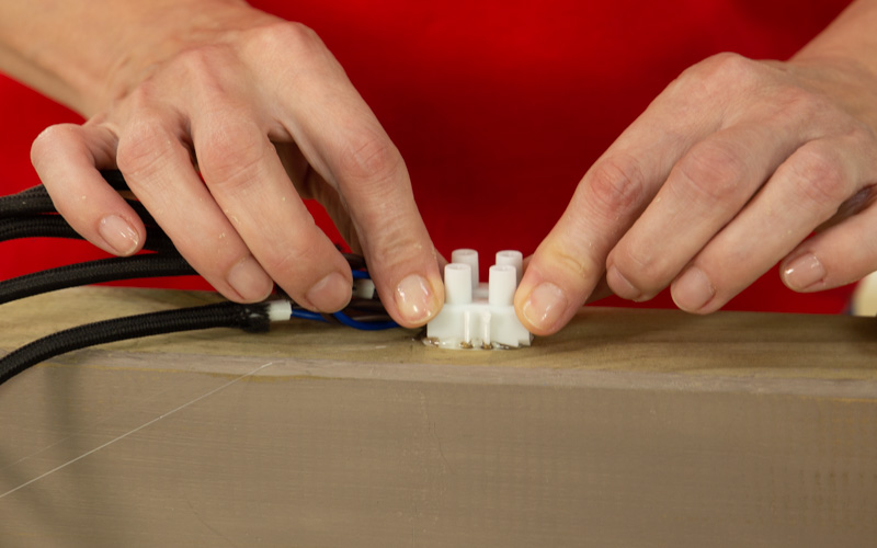 Las distintas lámparas irán unidas con clemas a un trozo de cable. Comienza conectando el cable azul y el marrón de una de las lámparas a una clema, después corta un trozo de cable nuevo y pélalo para conectar en el lado enfrentado de la clema los cables. Tendrán que coincidir azul con azul y marrón con marrón. Después conecta el extremo del trozo de cable en otra clema y a ella.