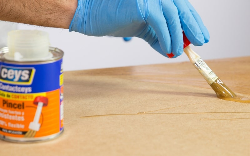Ahora vamos a pegar en el tablero de madera el trozo de moqueta que hemos cortado. Utiliza para ello cola de contacto. En primer lugar aplícala con una brocha. Después, para distribuir mejor la cola por todo el tablero, utiliza una pequeña tabla de madera, será más fácil de extender, más rápido y no dejarás ninguna zona con una cantidad excesiva de producto.