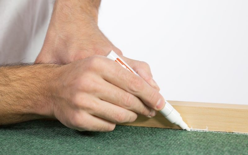 Pega los listones a la moqueta con cola para madera. Para que mantenga el contacto con fuerza coloca unos sargentos que ejerzan presión durante unos minutos y deja secar.