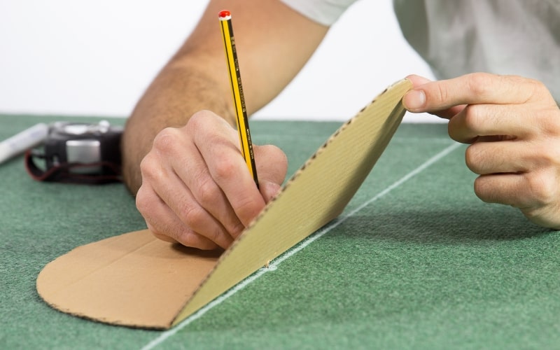 Lo primero que vamos a hacer es marcar por donde vamos a cortar la moqueta. Con ayuda del tablero de madera, marcaremos con lápiz el límite donde cortaremos. Deja un par de centímetros más para asegurarte de que después encaja. Siempre hay tiempo de cortarlo a última hora. Nuestro tablón de madera mide 170x110 cm.