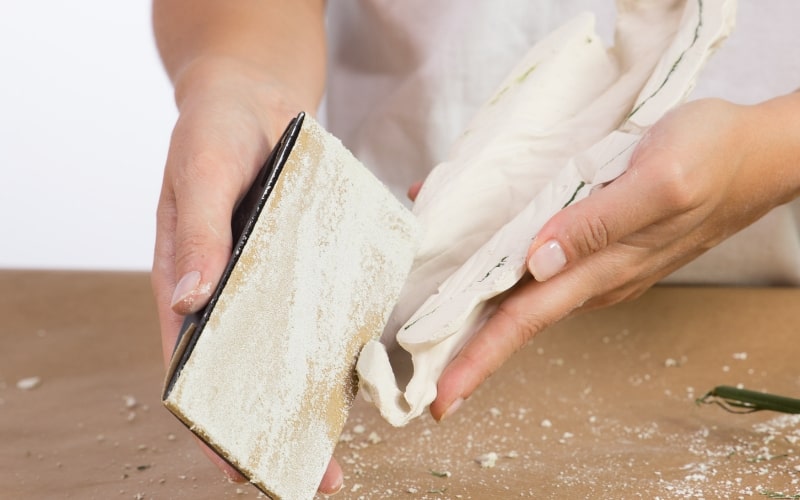 Limpia bien las hojas con un trapo húmedo para eliminar el polvo y las impurezas. Para que la hoja no ceda cuando viertas el yeso sobre ella, te recomendamos que coloques debajo de la misma unos rollitos de papel de estraza o periódico, así conseguirás que adopte una forma más cóncava.