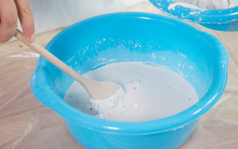 En primer lugar vierte el agua y en segundo lugar el yeso. Es importante que remuevas muy bien la mezcla y que esta quede densa. De esta manera el resultado será mucho mejor. Para remover el yeso hazlo con una cuchara de madera.