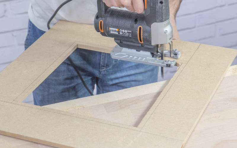 Una vez tengas hecho este último cuadrado, corta por esta línea con la sierra de calar. Te recomendamos que primero hagas un agujero con una broca de pala para que te resulte más sencillo cortar por esa zona de la madera.